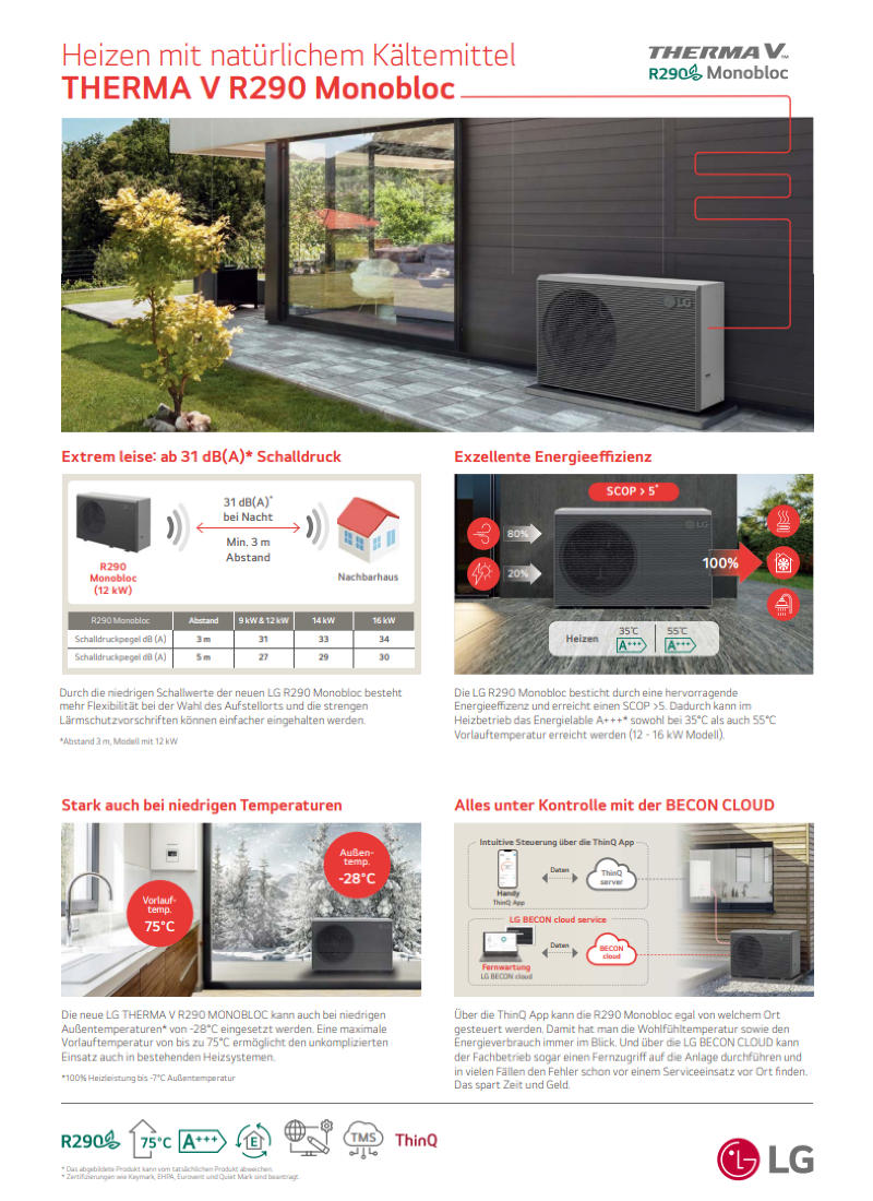 Die LG R290 Monobloc besticht durch eine hervorragende Energieeffizenz und erreicht einen SCOP >5. Dadurch kann im Heizbetrieb das Energielable A+++* bei 35 °C und 55 °C Vorlauftemperatur erreicht werden